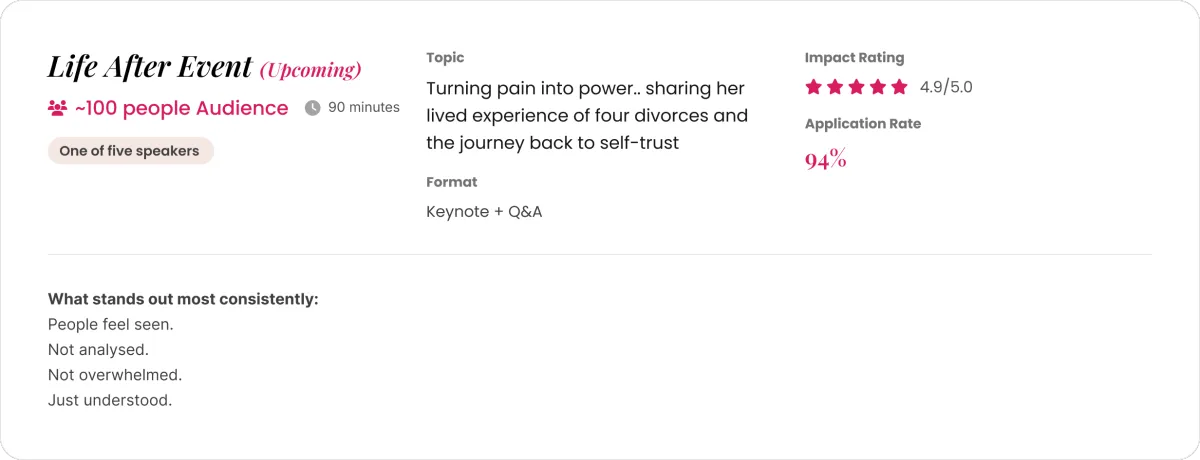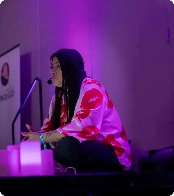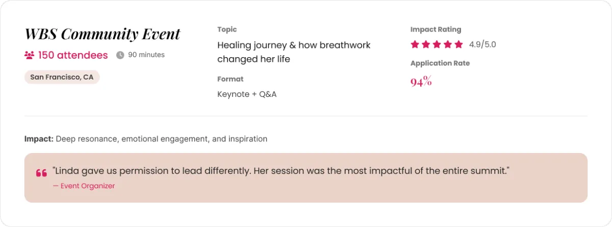 Blending storytelling, neuroscience, breathwork, and practical nervous-system tools, she creates an experience where people don’t just understand - they feel the shift.